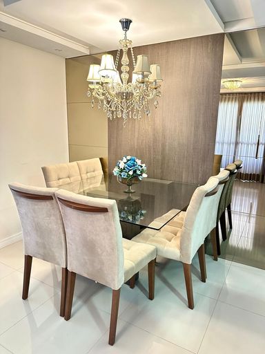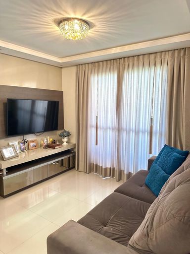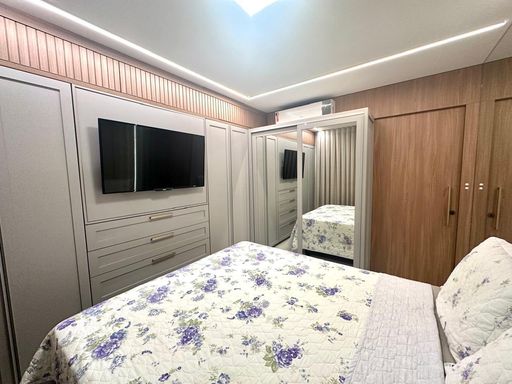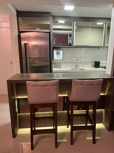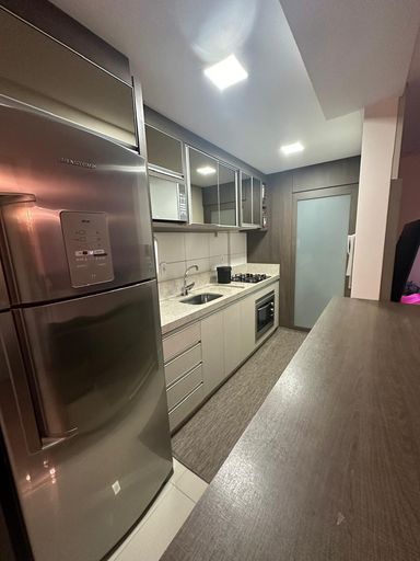 O imóvel fica totalmente mobiliado, saindo apenas as TVs e as camas. Possui 3 dormitórios, sala e cozinha integradas, sacada com churrasqueira, banheiro social, área de serviço e vaga de garagem coberta.
